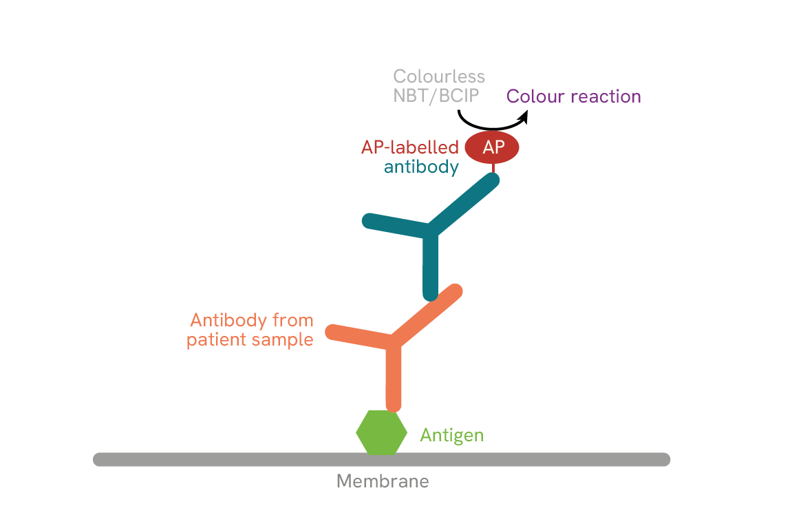 ウエスタンブロットは、スクリーニング検査(間接蛍光抗体法またはELISA)の陽性結果を確認すべき場合や、さらに区別する場合に最適な方法です。ブロットストリップは、抗原を含む固相として使用されます。それらは、電気泳動により分子量に従って分離された抗原抽出物でコーティングされています。